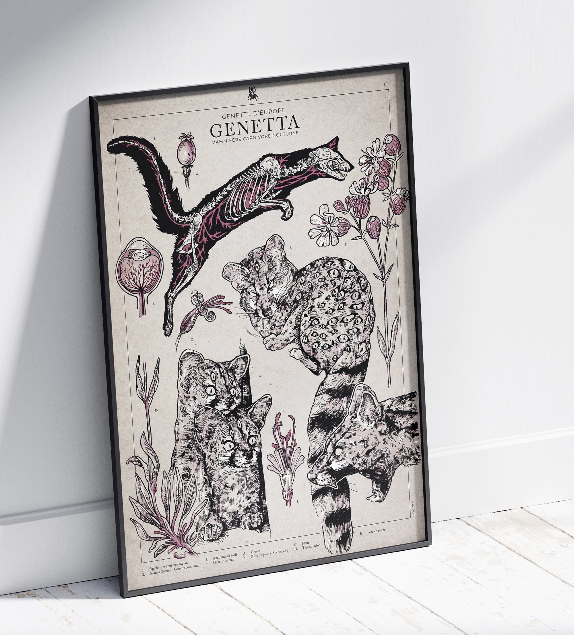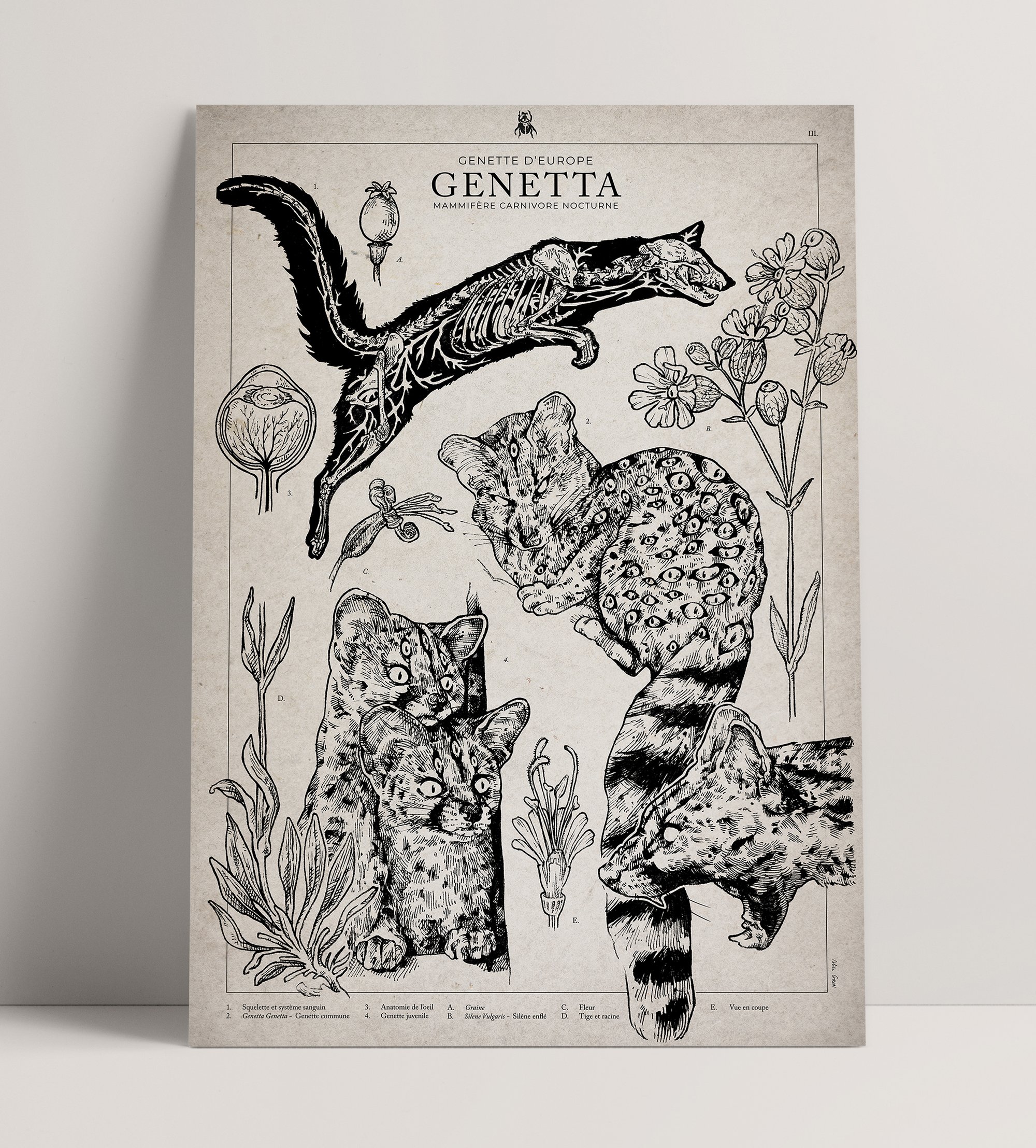 Planche naturaliste III, Genetta, la genette d'europe - Mammifère carnivore nocturne et la Silène Vulgaris - Silène enflée